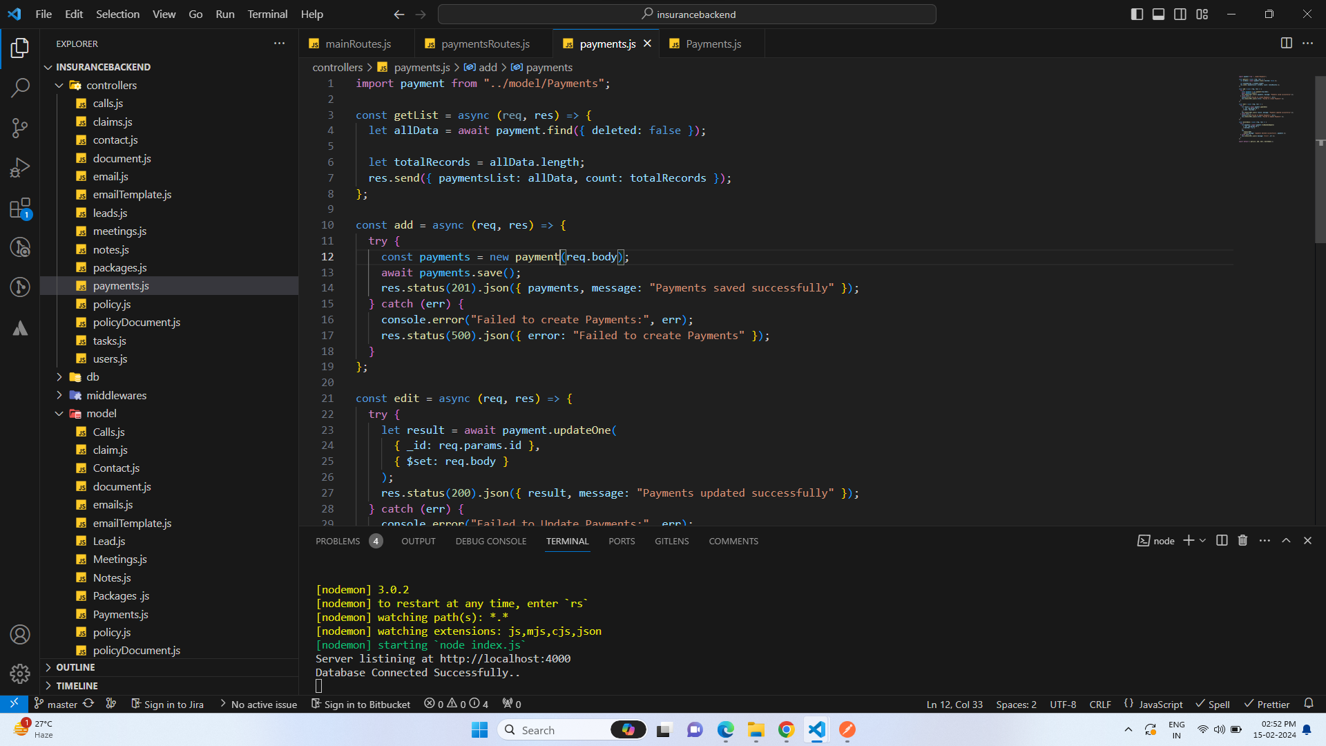 In terminal backend code running on port at http://localhost:4000/ that looks like this: